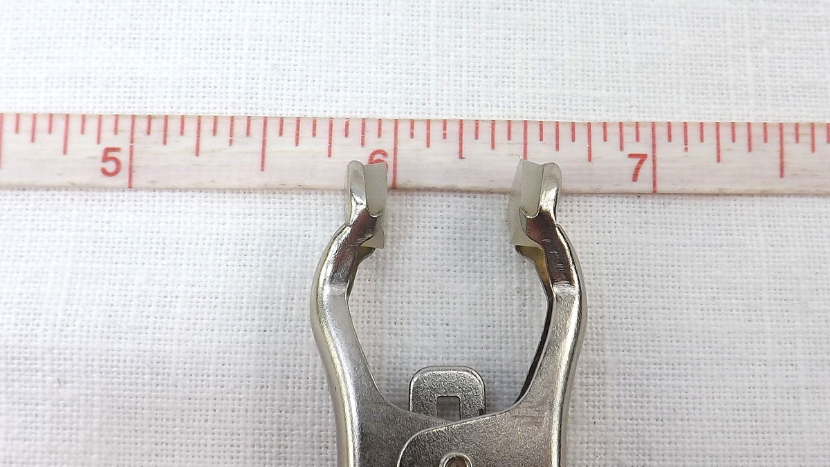 Sizes: Jaws open to about 0.5 inch. Each clamp is 3.5 inches long and about 1.5 inches wide.